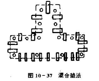 5)混合墊法(圖10-37):根據設備底座的形狀和地腳螺栓間距的大小來放置,金屬切削機床一類的設備大都采用這種方法。