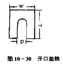 3)開口墊鐵:用于安裝設在金屬結構上的設備及有兩個以上面積都很小的底角支持的設備。這種墊鐵的形狀如圖10-30,其尺寸如下: