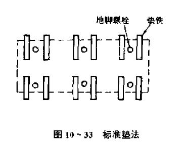 1)標準墊法(圖10-33):一般都采用這種墊法,它是將墊鐵放在地腳螺栓的兩側,這也是放置墊鐵的基本原則。